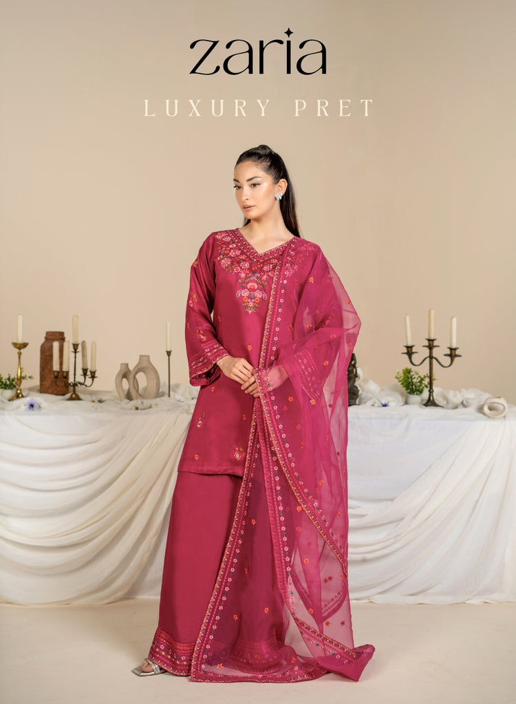 Ready To Wear (3 Piece)Fabric: ChiffonStyle: Long Shirt What's in the Box? - Long Shirt- Dupatta- Trouser Noor is an enchanting dream dress, adorned with a meticulously crafted diamond neckline on shiny chiffon fabric. It captivates with multicolored lace embellishments on the border and...