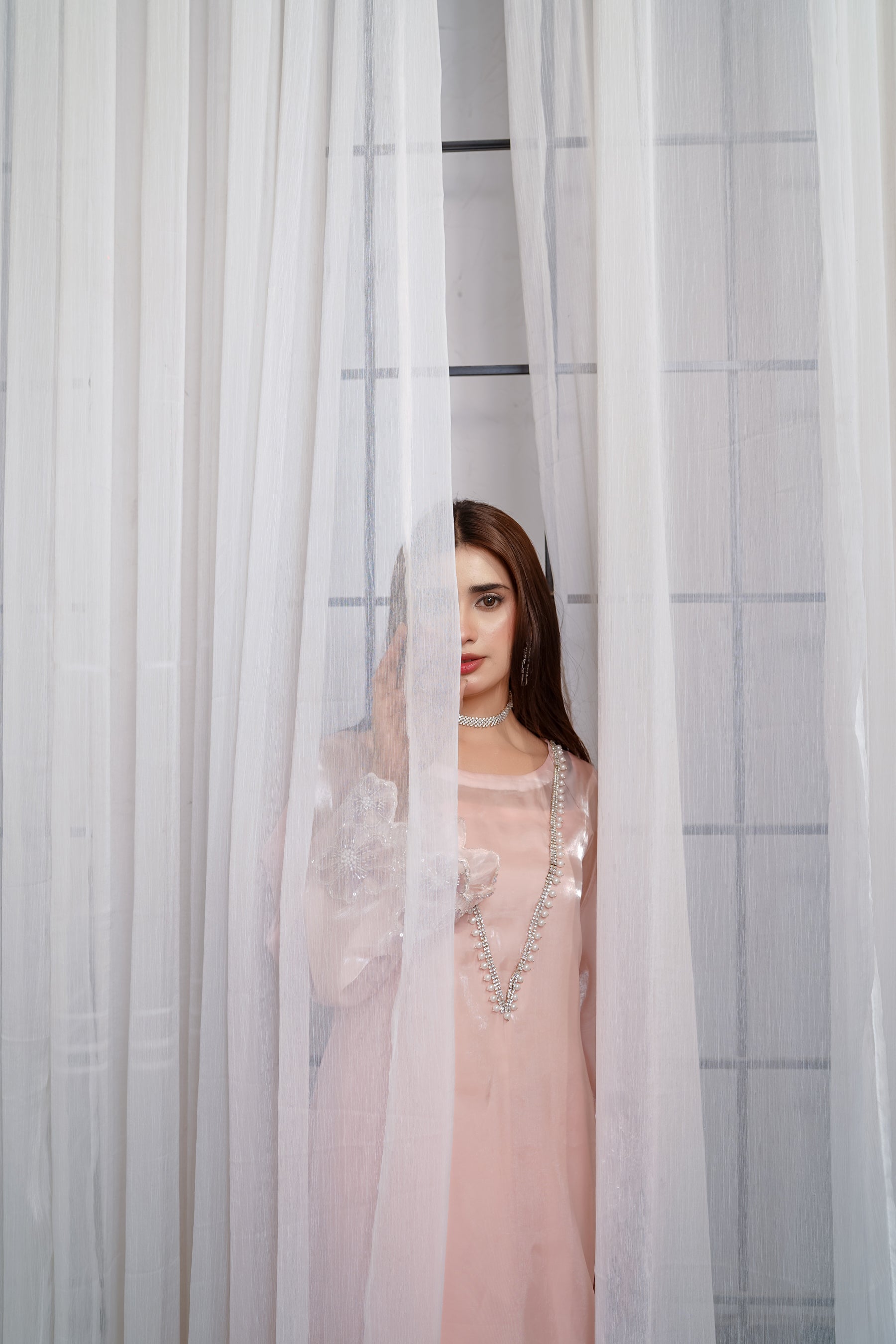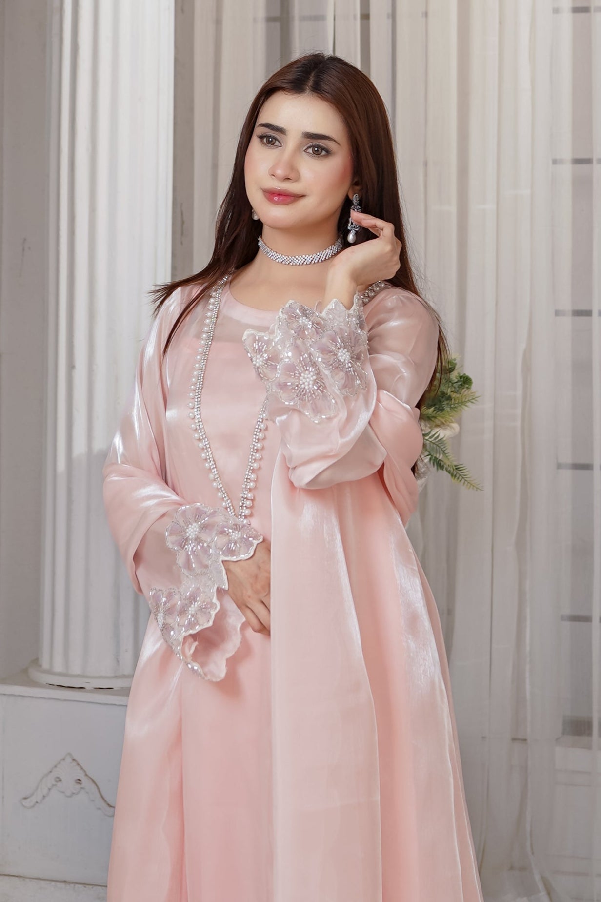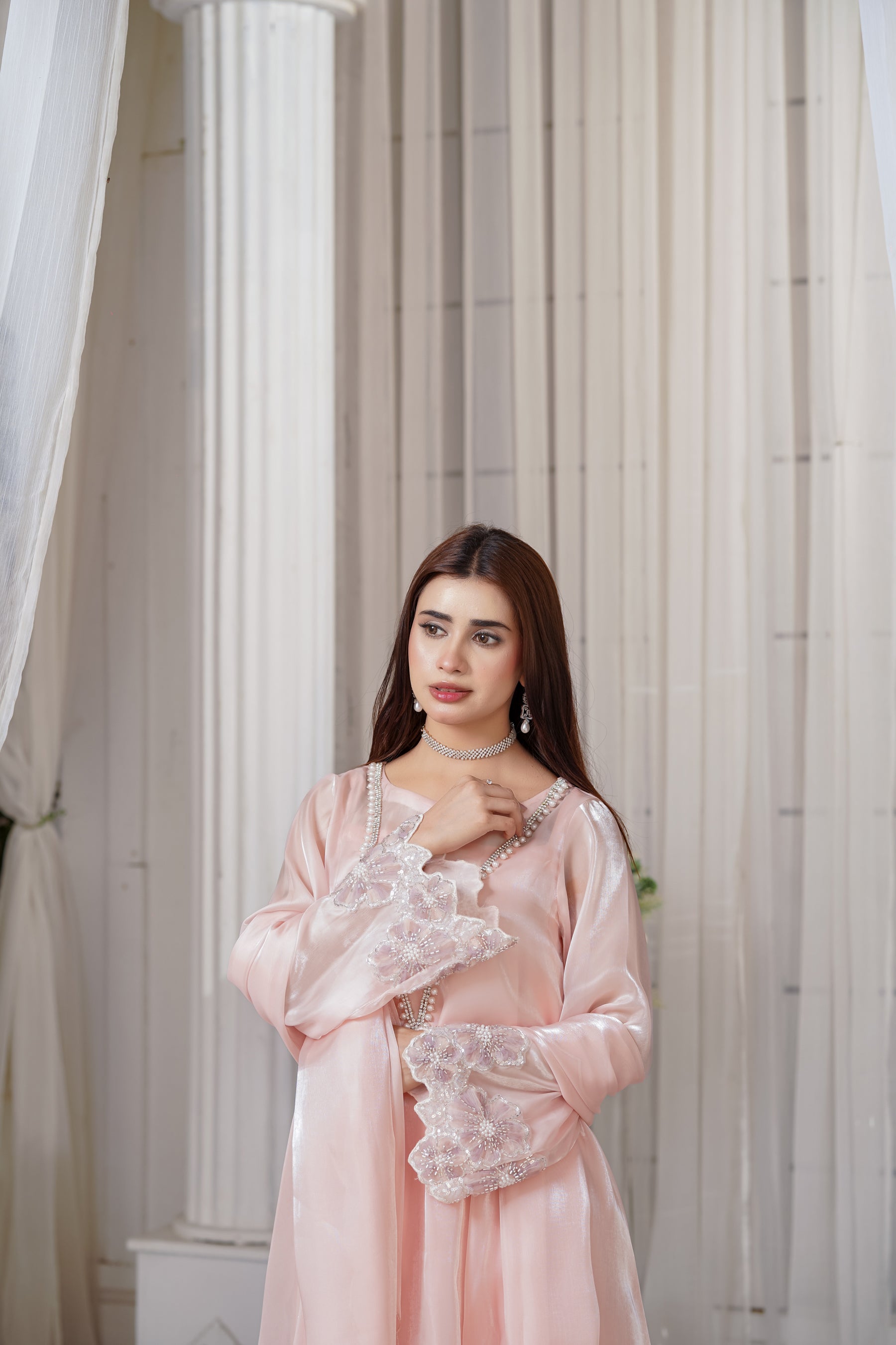 Drenched in a soft light pink hue, this lava silk ensemble exudes refined elegance. The flowing maxi is adorned with delicate crystal stonework and pearls along the neckline, adding a touch of understated glamour. The true highlight lies in the sleeves, where intricate floral cutwork embroidery meets shimmering cut-dana embellishments, creating an enchanting interplay of texture and light. Paired with a plain lava silk dupatta, this ensemble is the epitome of timeless grace and sophistication.