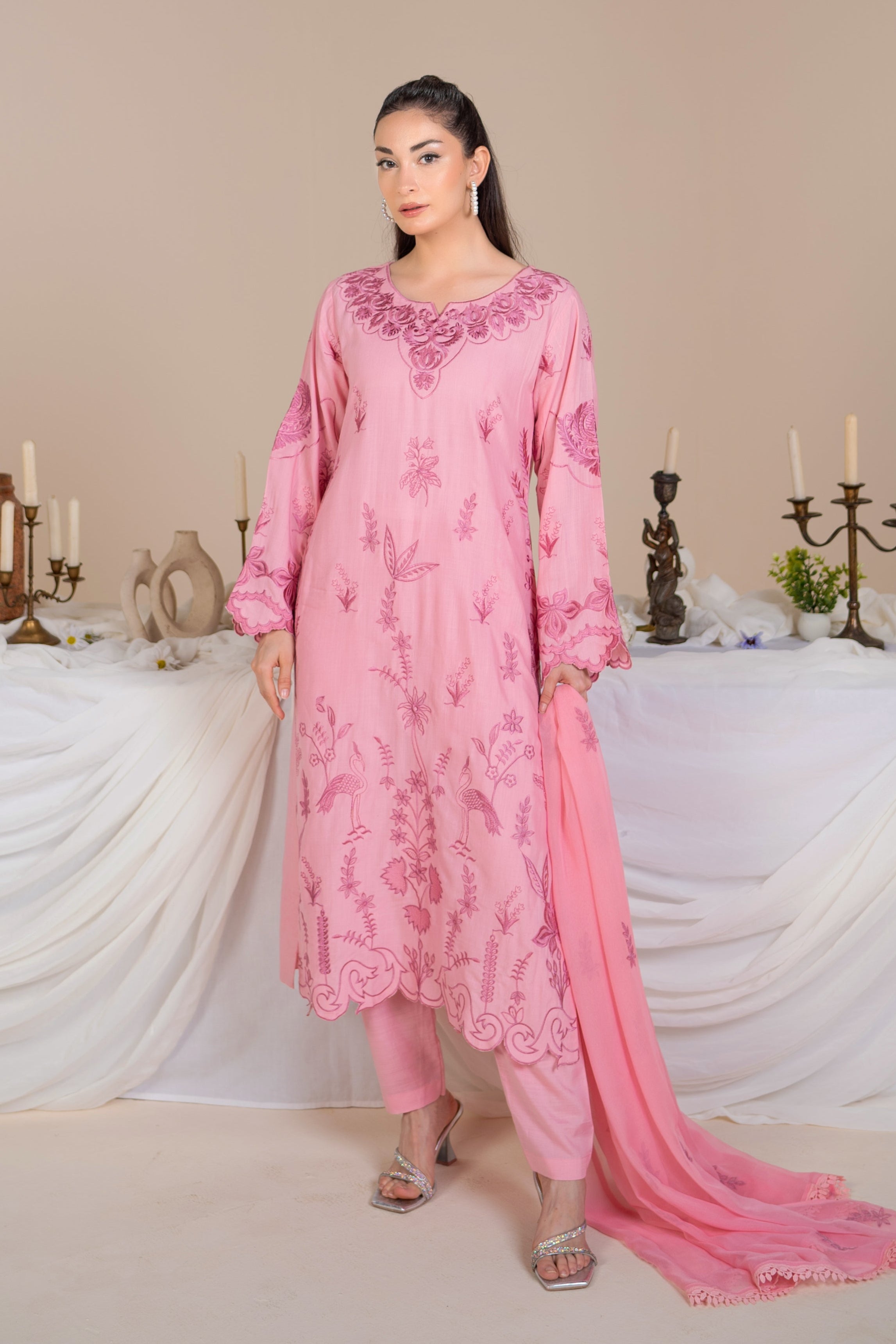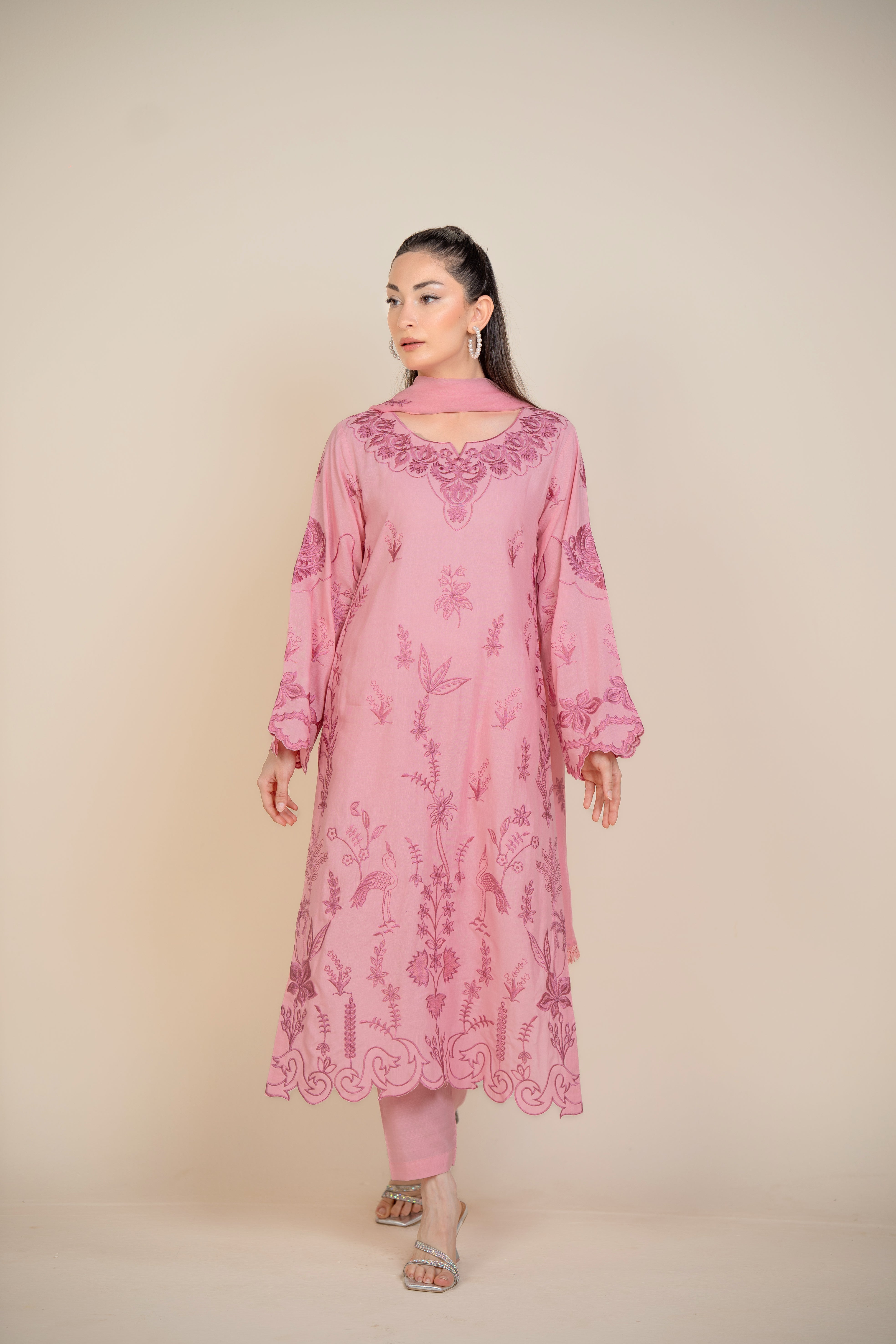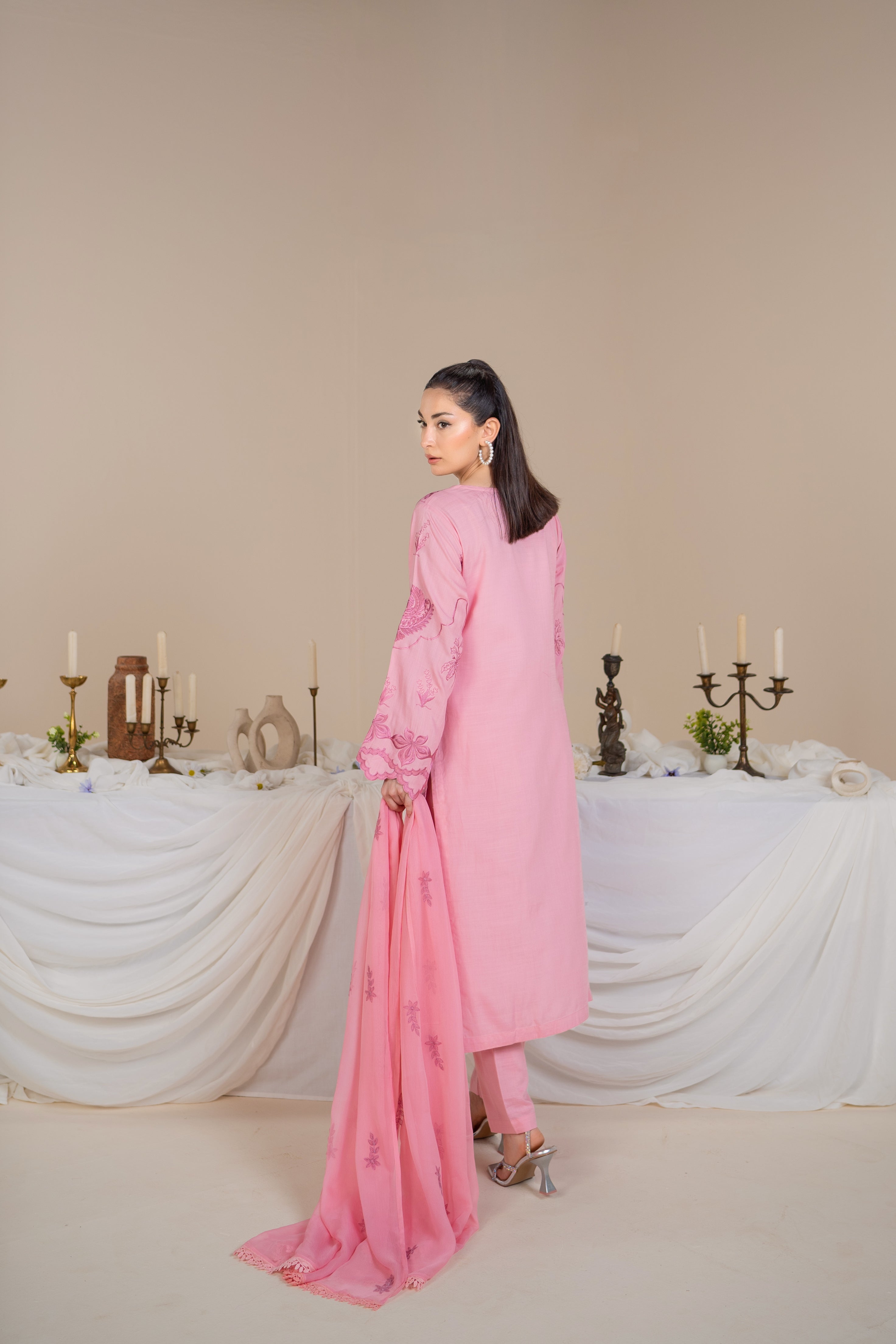 Blushed in the soft poetry of pink, this ensemble speaks the language of grace and refinement. The shirt blooms with tonal embroidery, its natural motifs creating a garden of artistry across the fabric, while the sleeves, delicately adorned and finished with a scalloped hem, echo feminine charm. An embroidered dupatta edged with lace detailing drapes like a whisper of elegance, completing the look with subtle sophistication. Paired with sleek pencil trousers, this ensemble is an exquisite choice for moments that call for understated yet timeless beauty.