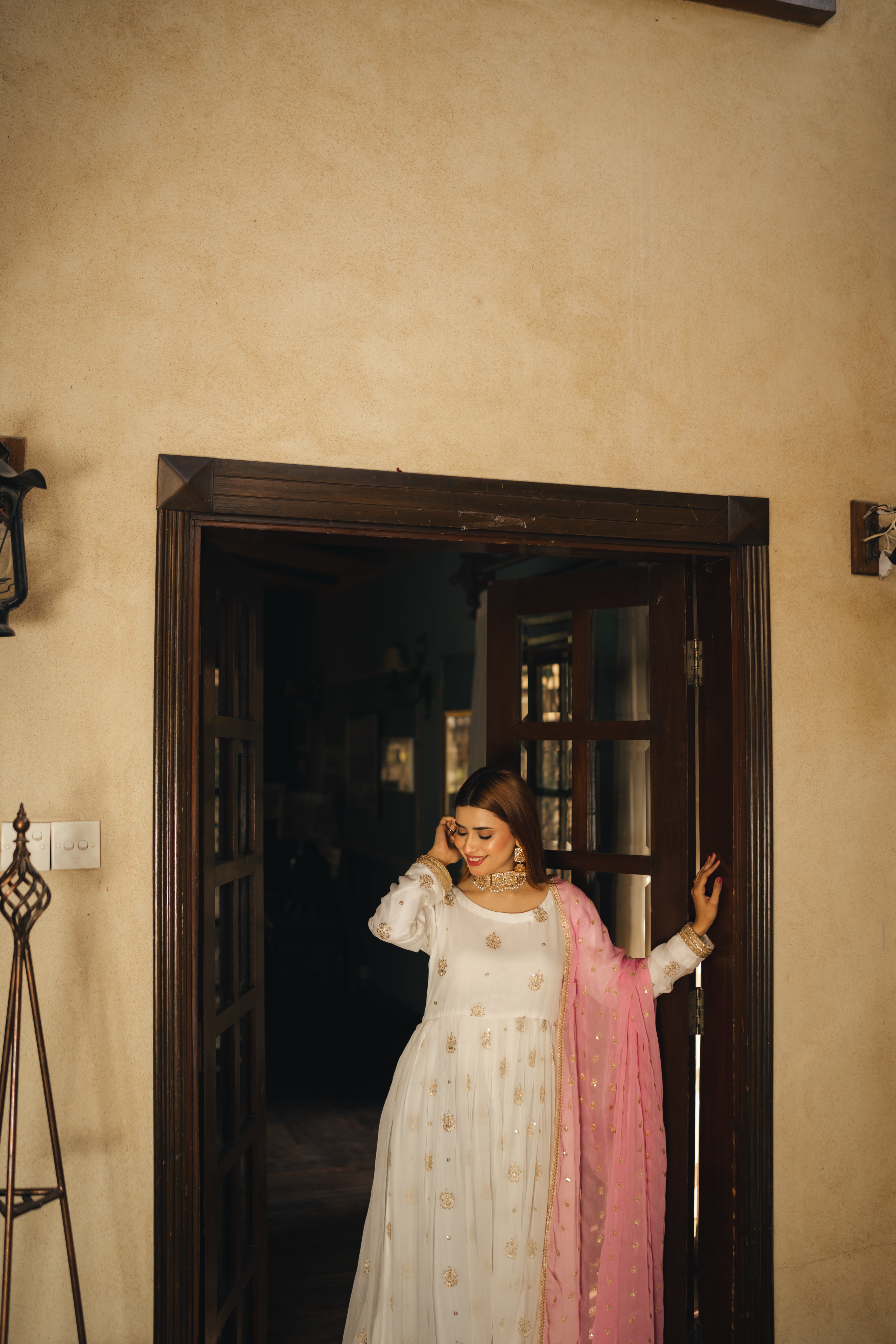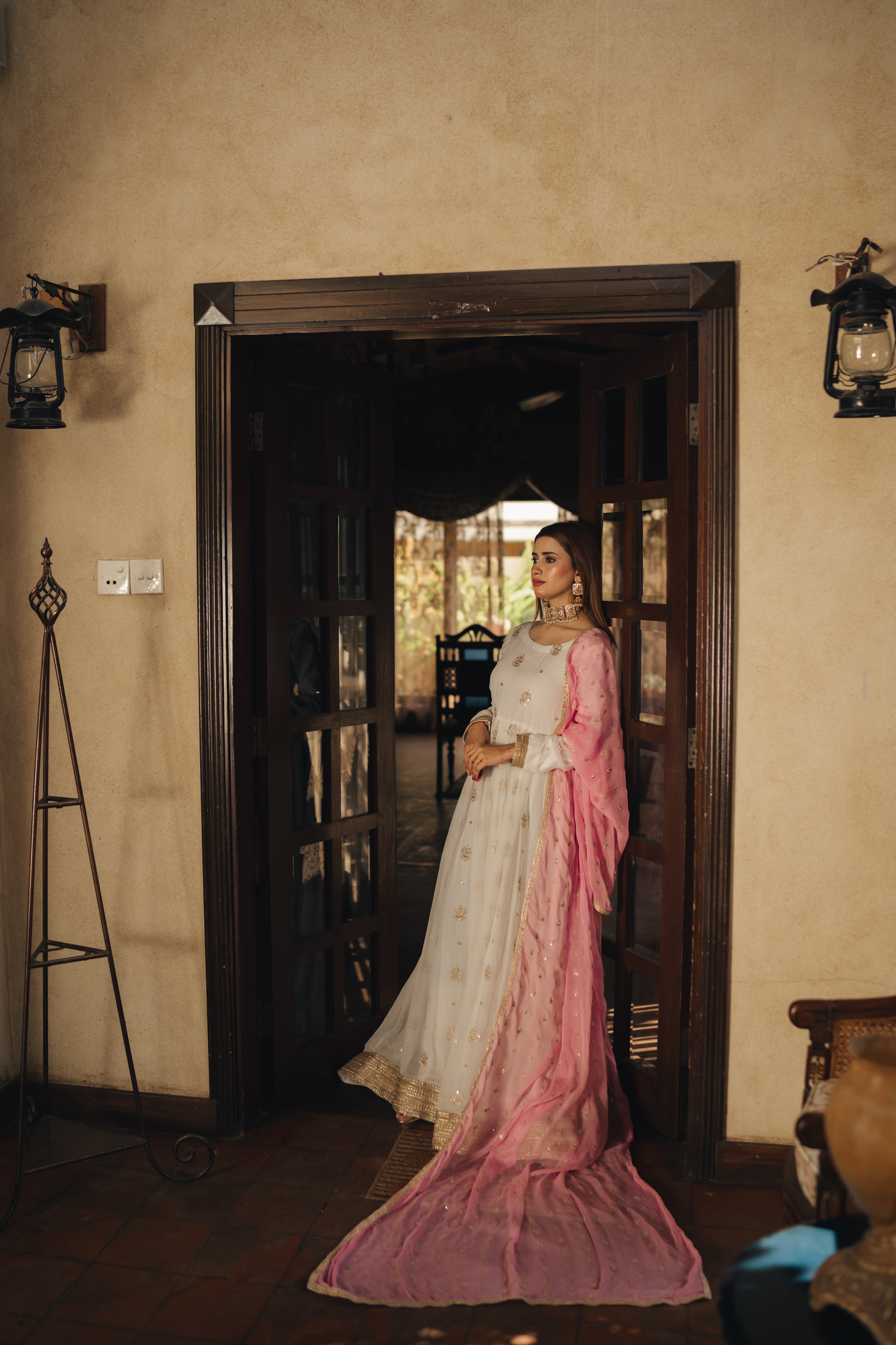 Introducing our enchanting White Embroidered Chiffon in Anarkali style, featuring meticulous plate-style stitching for a flattering fit. The frock is elegantly adorned with a heavy border, adding a touch of opulence to your ensemble. Accompanied by a beautiful light pink chiffon dupatta, delicately embellished with embroidery and four-sided lace, this dress exudes grace and sophistication. Embrace the ethereal beauty of this ensemble, perfect for special occasions where you want to radiate timeless charm. Step into the spotlight with this captivating dress that effortlessly blends tradition with modern elegance.