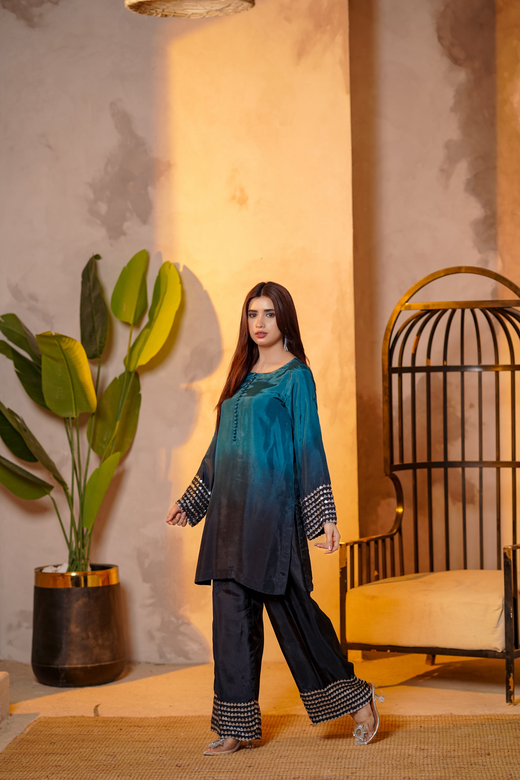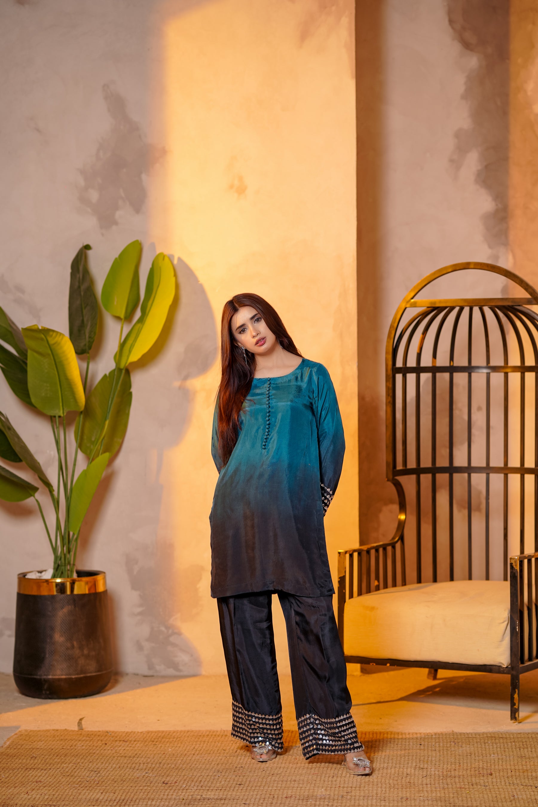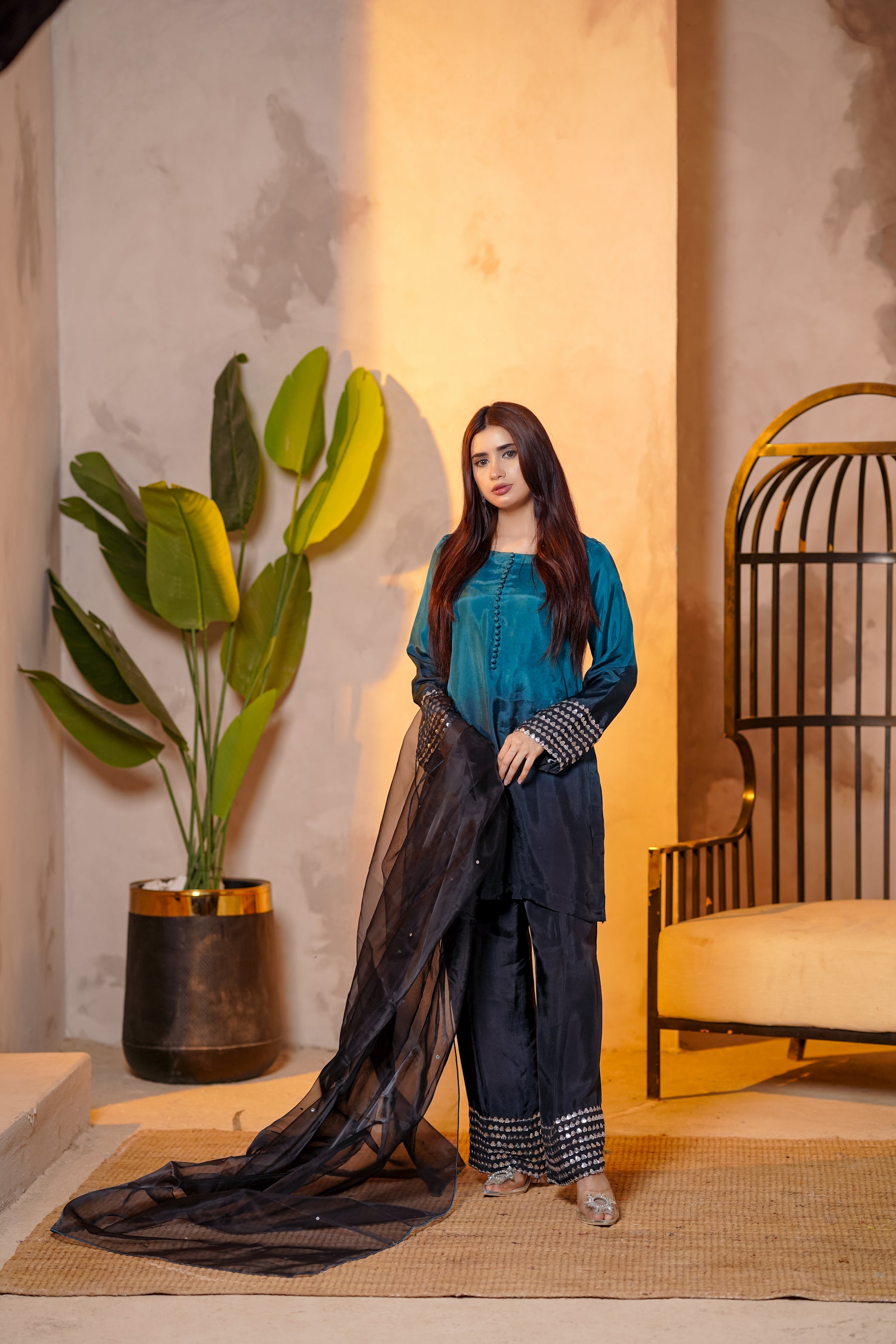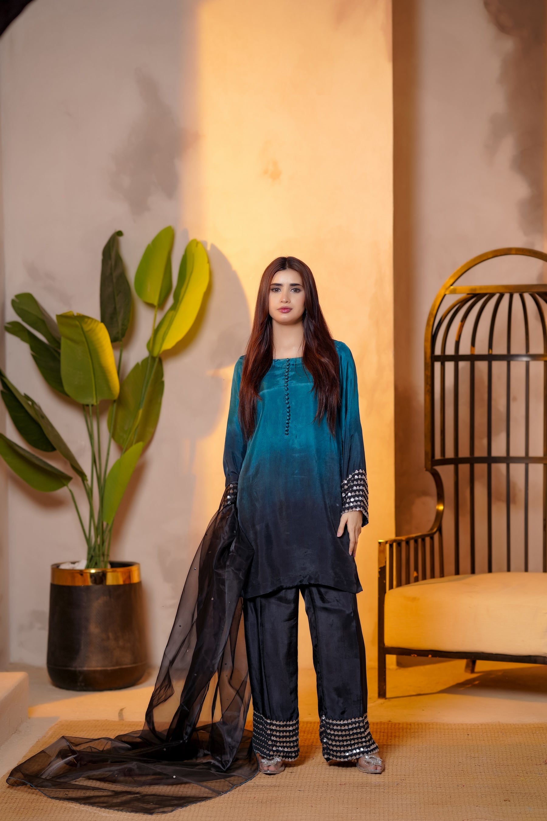 Drenched in a mesmerizing ombre that flows from rich teal to deep black, this ensemble is a true masterpiece. The shirt’s gradient beauty is complemented by delicately placed buttons along the neckline, adding a touch of refinement. The sleeves are adorned with a shimmering sequin-embroidered border, enhancing the outfit’s elegance. Paired with straight pants featuring a matching sequin-embroidered hem, the look is completed with an organza dupatta, delicately sprayed with sequins for a subtle, luminous finish.