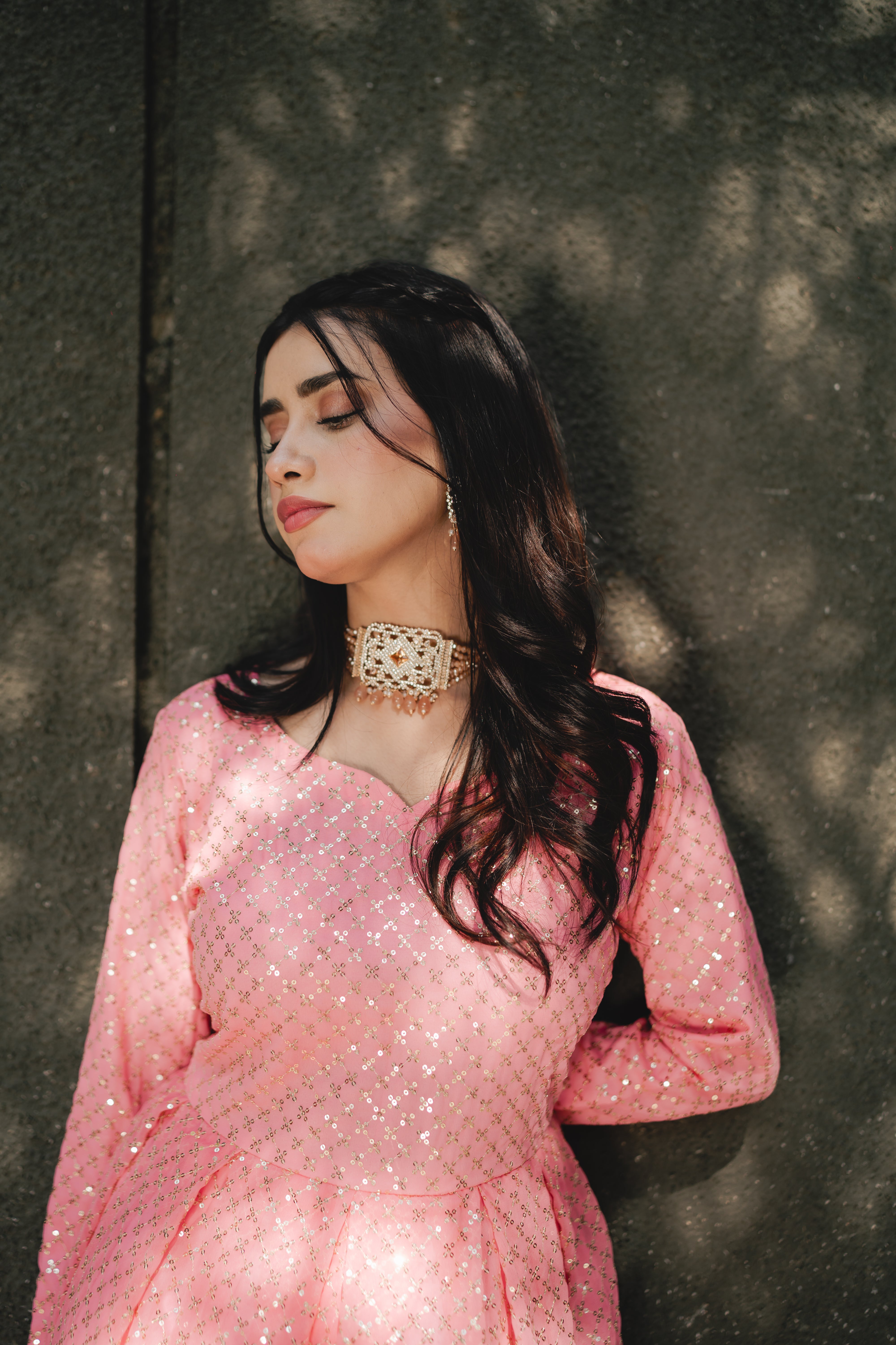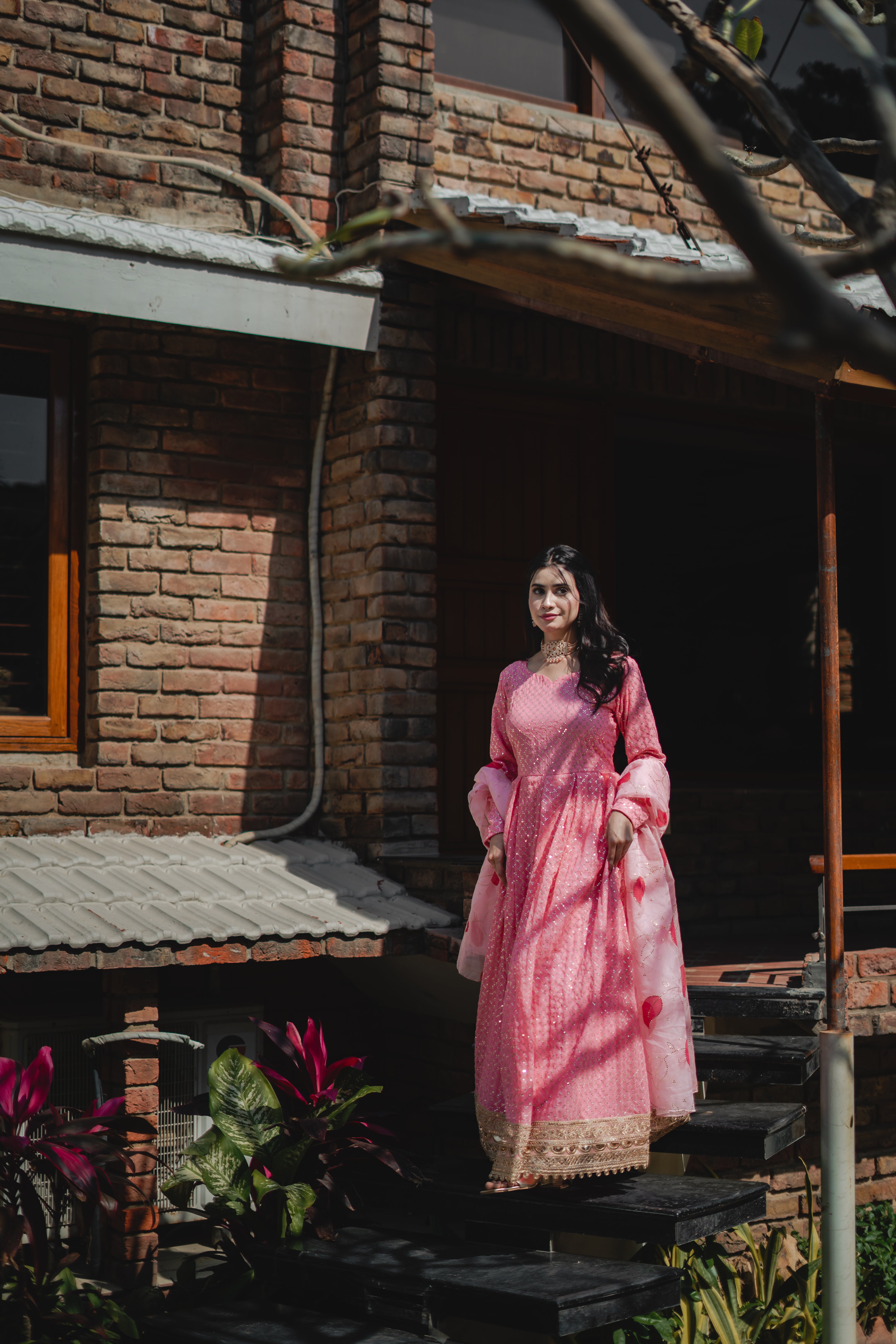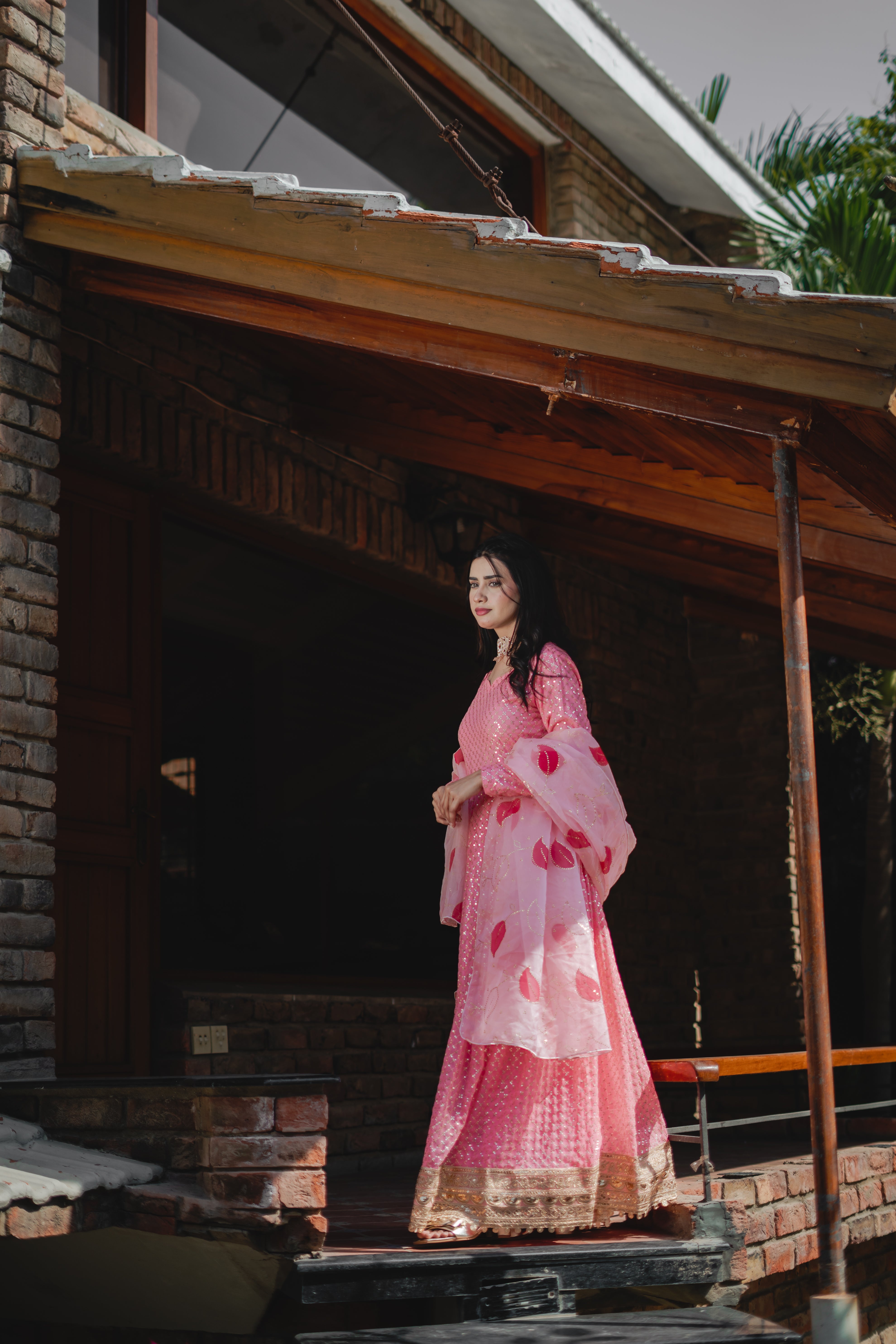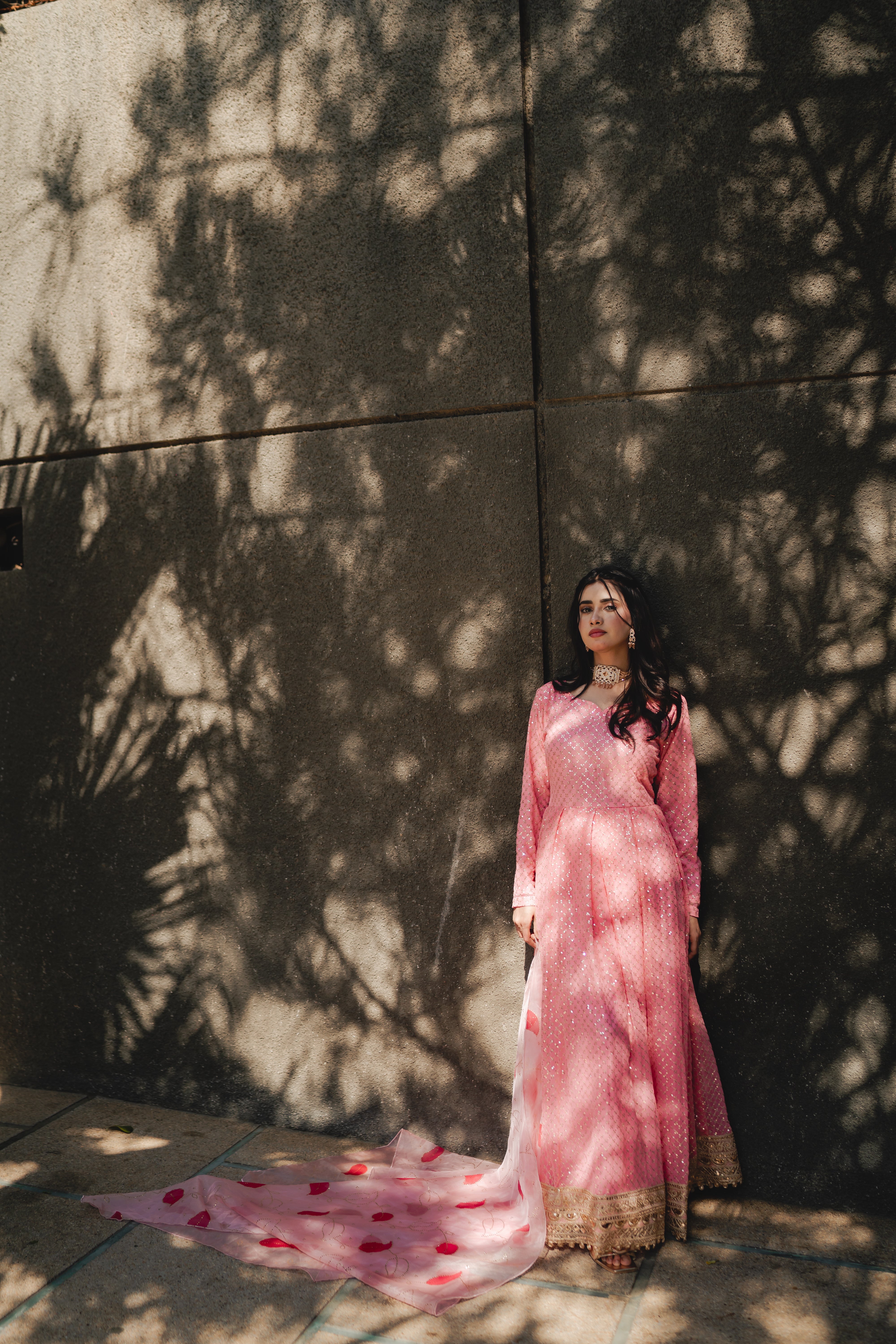 Petunia, a stunning pink frock, is adorned with sequins throughout, enhanced by a 5-inch-wide border for added detail. It is beautifully complemented by a baby pink organza dupatta featuring delicate makesh work and floral prints, adding to the overall elegance of the ensemble.