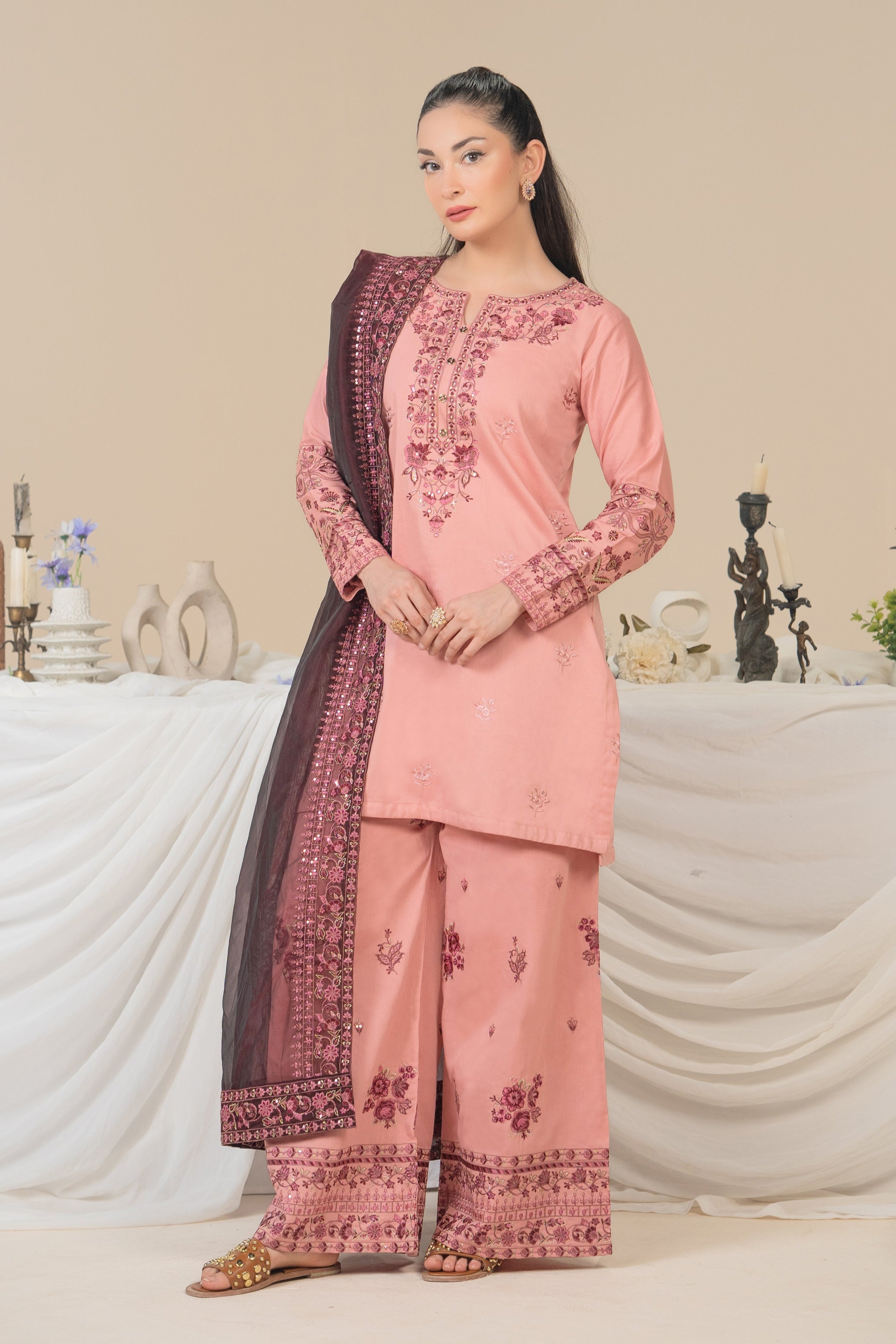 Radiating a gentle yet majestic charm, this tea pink ensemble is crafted as a true statement of elegance. The shirt glows with a stunning neckline and scattered motifs, embroidered in shades of maroon, pink, and tea pink, while threads of gold zariwork weave through the design like glimmers of sunlight. The trousers, richly detailed with floral motifs and a heavily embroidered border, echo the grandeur of the shirt. A contrasting maroon dupatta with its lavish four-sided embroidered border completes the attire—an ode to opulence with a contemporary edge.